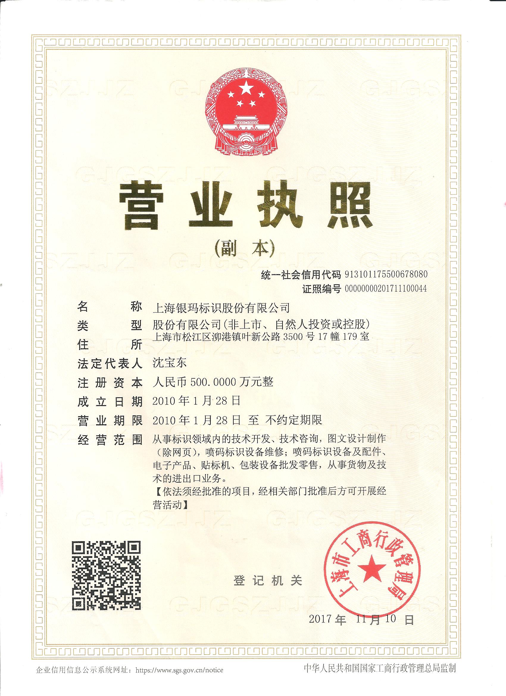 上海銀瑪標識股份有限公司(原名:上海銀瑪標識技術有限公司)成立于2010年元月。是專業從事噴碼標識設備、激光智能標識系統及材料表面賦碼技術等研發設計、推廣應用的企業。可為用戶提供“一物一碼”技術支持與服務。公司2015年通過ISO9001質量管理體系認證,為上海市科技創新型中小企業,并獲市科技創新基金支持。